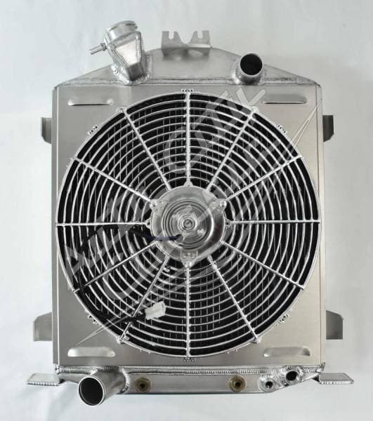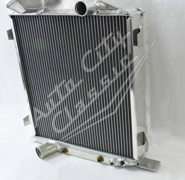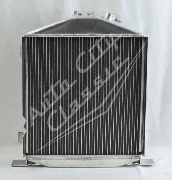 100% welded aluminum replacement radiator for 32 Ford Lo-boy, Street and rat rods with Ford motors and 3" chopped grill shells. Stamped tank, no extra welds on the edges! Built in transmission cooler- dual 1 1/8" high flow tubes for maximum cooling.