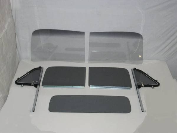 Set Includes: 2 Piece Windshield, 2 Vent Glasses assembled in Frames and Posts, 2 Door Glasses assembled in Frames and Channels and Rear Center Back Glass