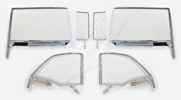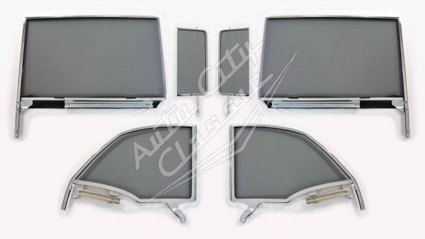 Set Includes: 2 Vent Glasses, 2 Door Glasses and 2 Quarter Glasses fully assembled with new glass, upper frames and lower channels. Ready to install.