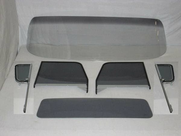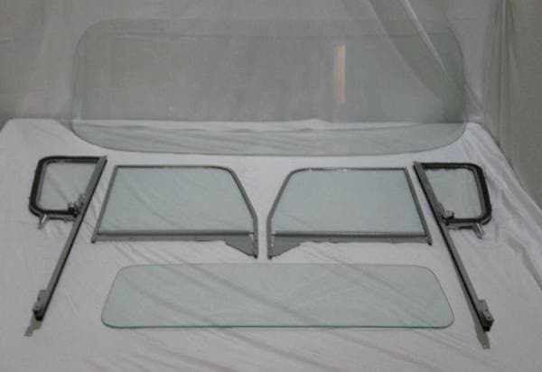 Set Includes: Windshield, pair of vent glasses assembled in new chrome frames and posts, pair of door glasses assembled in new frames and lower channels and small rear back glass