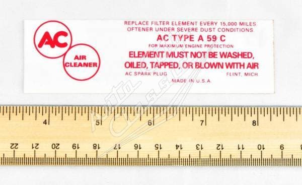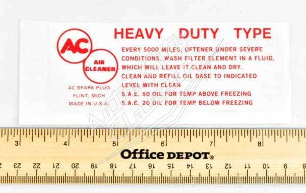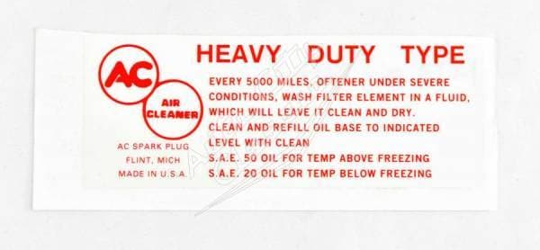 New reproduction air cleaner decal for 58-61 Chevy models. This decal details the maintenance schedule, oil type and other information for engine function. Typically found on the end of a single air cleaner snout or between the 2 snouts on a 348 tri-power.
