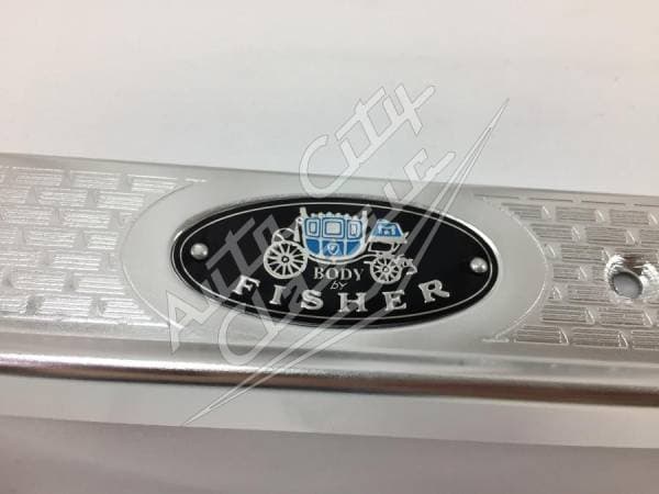 New reproduction pair of sill plates for 58 Chevy 2 Door models. These metal trim pieces are located on the inner lower door frame, beneath the door opening. Includes the riveted Fisher Body emblem. Sold as pair.