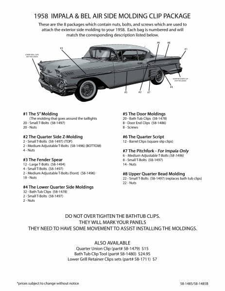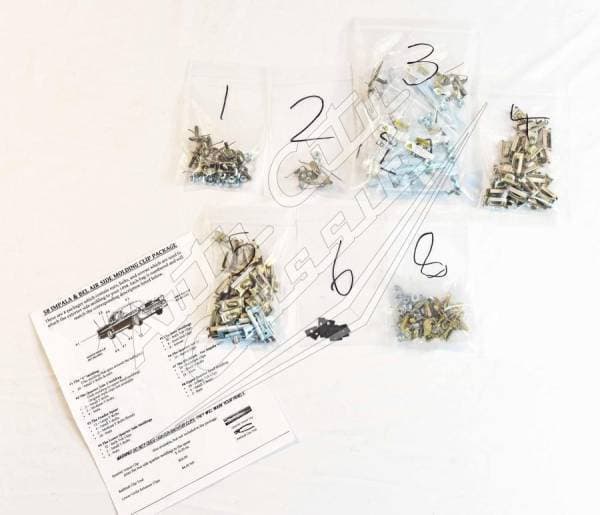 This is a collection of clips designed to attach or secure body side moldings to your 58 Chevy Bel Air hardtop. Our clips are made to be used on specific moldings. For the best restoration, buy the correct clips.