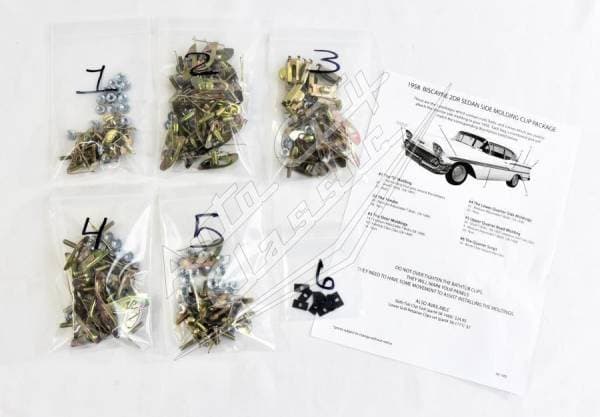 This is a collection of clips designed to attach or secure body side moldings to your 58 Chevy Biscayne 2 Door Sedan. Our clips are made to be used on specific moldings. For the best restoration, buy the correct clips.