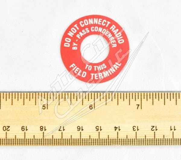 New reproduction generator warning tag for 58 Chevy models. This tag was a visual reminder for installers to prevent incorrect wiring. These tags were particularly important for vehicles with a radio. This tag is attached to the generator itslef and is installed by removing the field wires from the field terminal.