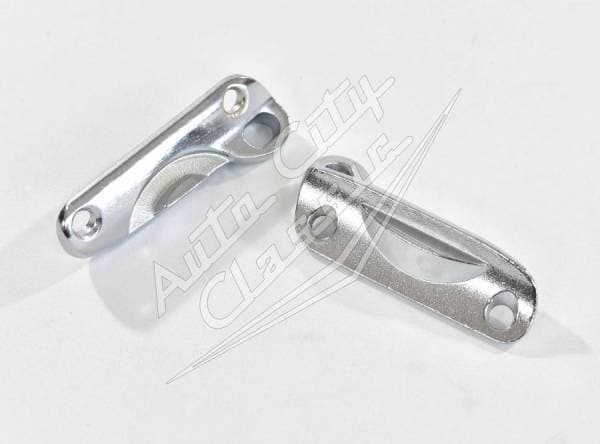 New pair of reproduction top striker plates for 58-60 Chevy Impala convertible models. These metal pieces are mounted to the top of the car and are crucial for the convertible top to secure properly.