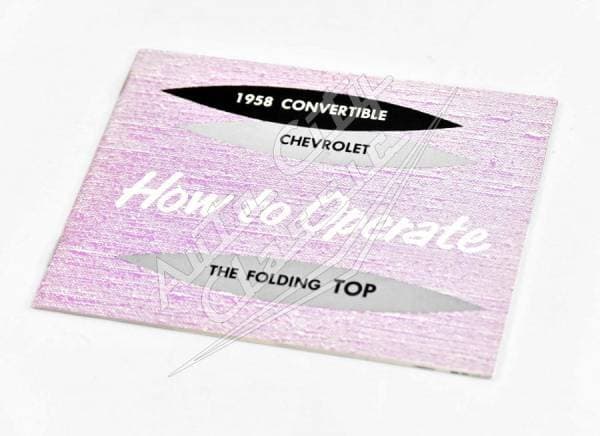 New reproduction 58 Chevy Impala "How to Operate" Top Instruction Book. This book was included with the owners manual because it has information that was not included in that manual and is specific to the convertible top. The book includes directions for operating the top (lowering, raising, boot installation), cleaning the top and care of the rear window.