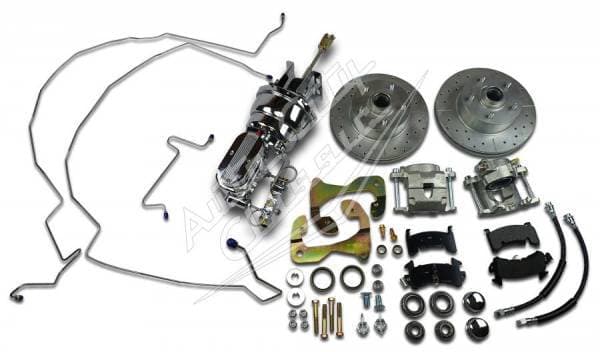 Kit Includes: 7" Dual diaphragm brake booster (1) and master cylinder (1) with correct firewall mounting bracket and clevis to mount the booster Proportioning valve with mounting hardware (1); disc brakes in the front and drum brakes in the rear Pre-bent oem material front brake line set (2); these lines go from the proportioning valve to the front calipers Calipers and pads (2) Drilled and slotted rotors (2) Hardware: C.N.C. cut caliper brackets, nuts, bolts, wheel bearings, wheel seals, rubber hoses, banjo bolts, ect.