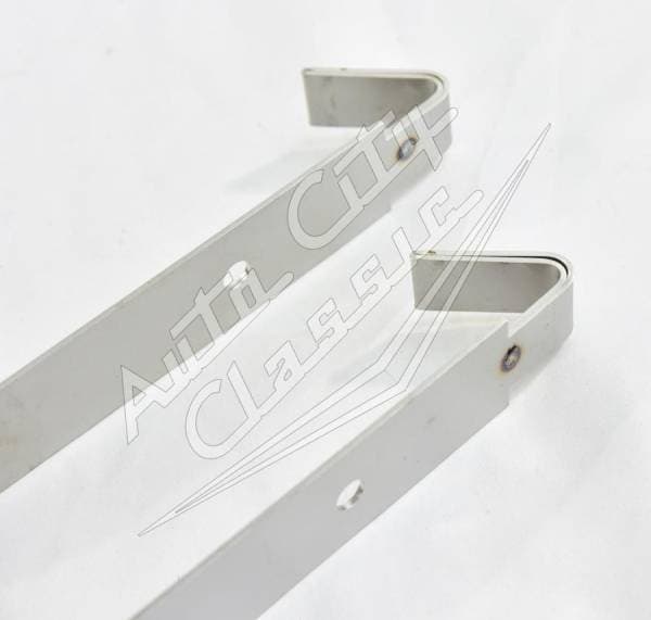 New reproduction stainless steel straps with pad and bolts for 58 Chevy models. Straps measure approximately 38 1/2" from hook to center of hole.