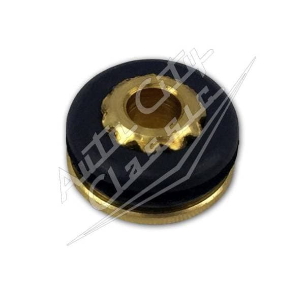 ew reproduction windshield wiper arm transmission bushing with seal for 58 Chevy models. This is the component that connects the wiper arm to the transmission mechanism, allowing for the sweeping motion of the wipers. The bushing provides a pivot point and the seal helps prevent water and other debris from entering the mechanism. Sold individually.