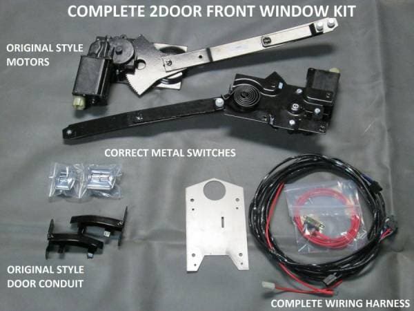 Kit Includes: Door Power Window Regulators with New Motors, Door Conduits, Power Wire Lead, Circuit Breaker, Wire Harness, Switches and Instructions.
