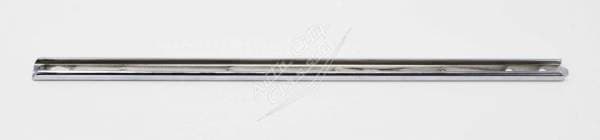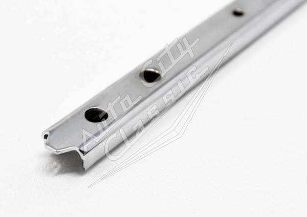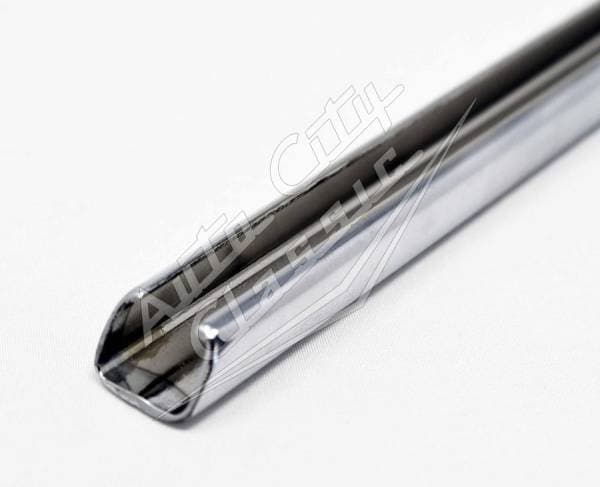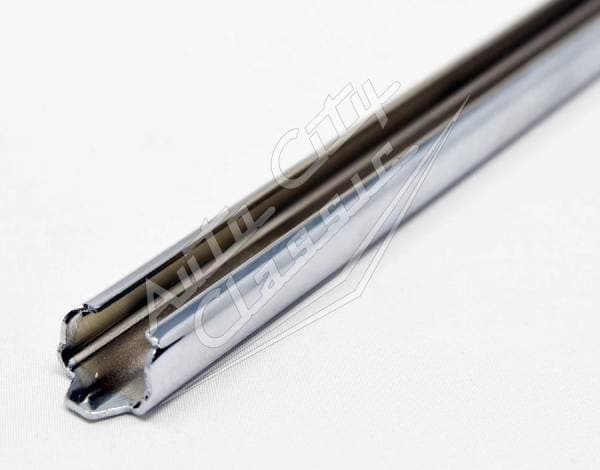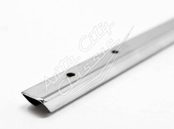 New reproduction quarter window vertical weathstrep retainer for 58 Chevy Impala and Pontiac Bonneville models. This chrome metal part attaches to the base of the stationary quarter glass to provide a channel for the vertical rubber weatherstrip to slide into and seal against the front door window when closed.