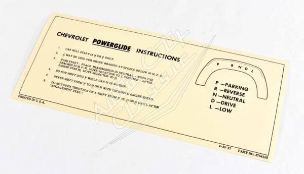 New reproduction powerglide instructions for 58 Chevy models. This instruction sleeve was placed on the sun visor to provide directions to the new owner on the use of the 2-speed powerglide transmission.