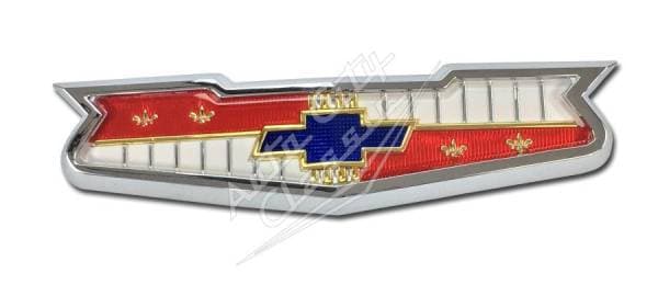 New reproduction hood emblem assembly for V8 58 Chevy models. High quality acrylic, red, white and blue classic Chevrolet bowtie hood emblem insert and emblem bezel frame.