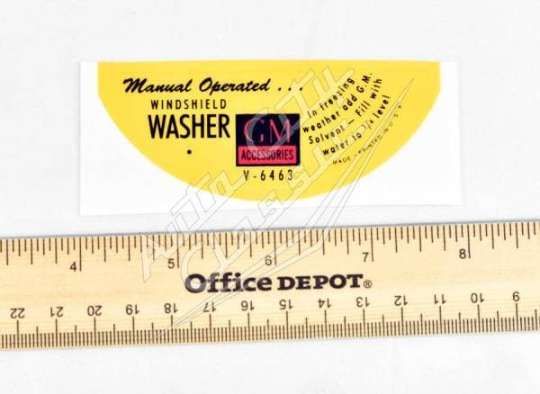 New reproduction windshield washer decal for 58 Chevy models. This decal is for all models with glass fluid bottles. This is a crucial detail piece for maintaining authenticity of any classic's engine compartment during restoration. Fits many GM models.