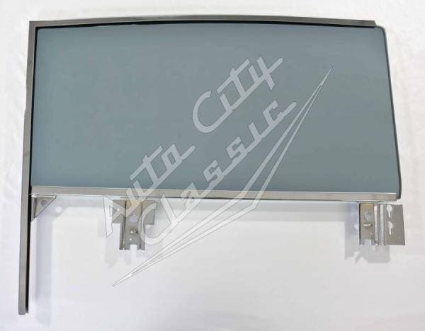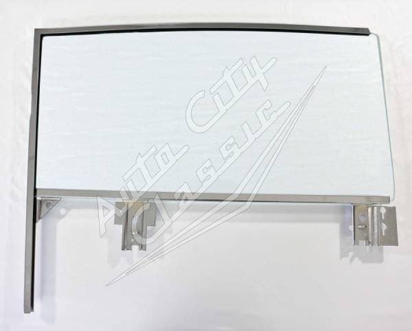 New door glass installed in new reproduction upper door glass frame and new reproduction lower door glass channel. Frames and Channels are quality plated.