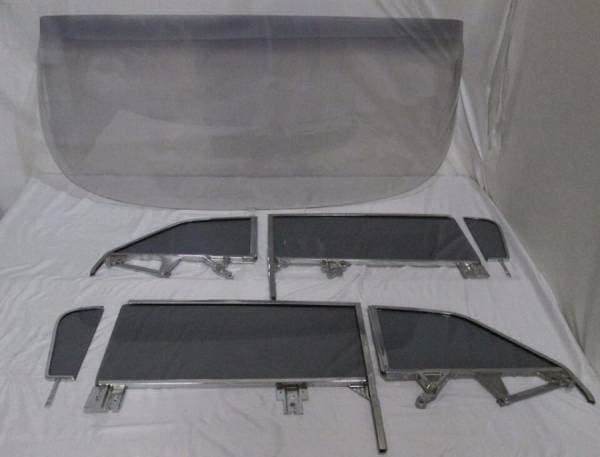 Set Includes: Windshield, 2 new vent glasses installed in new reproduction frames, 2 new door glasses installed in new reproduction upper frames and lower channels, 2 new quarter glasses installed in new reproduction upper frame and your re-chromed lower quarter channels. All reproduction or re-chromed pieces have quality plating.