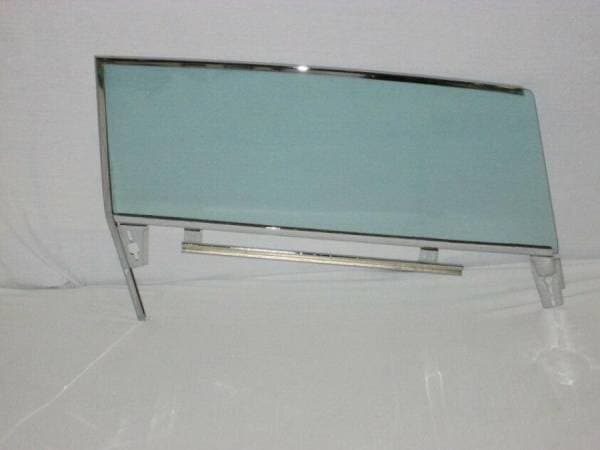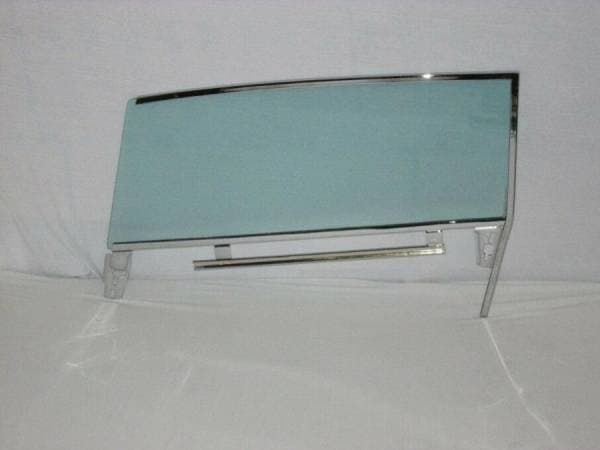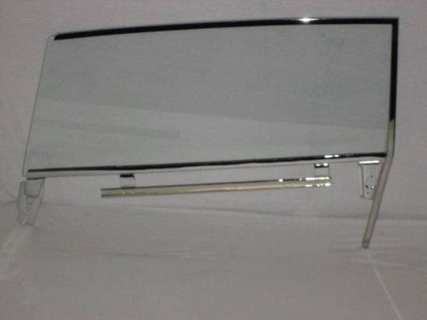 New door glass installed in new reproduction upper door glass frame and new reproduction lower door glass channel. Frames and Channels are "SHOW" quality plated.