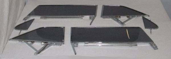 Assembled Side Glass SetFits Models: 1963-1964 Cadillac Convertible 62 Series, DeVille; Jobs 6267, ElDorado Biarritz; Jobs 6367Set Includes: 2 new vent glasses installed in new reproduction frames, 2 new door glasses installed in new reproduction upper frames and lower channels, 2 new quarter glasses installed in new reproduction upper frame and re-chromed lower quarter channel. All reproduction or re-chromed pieces have quality plating.