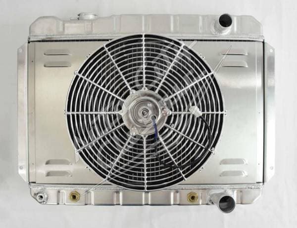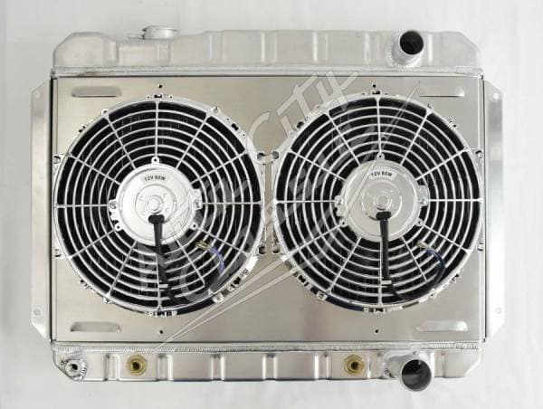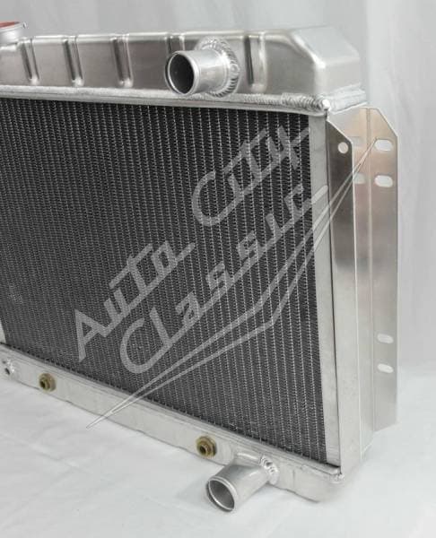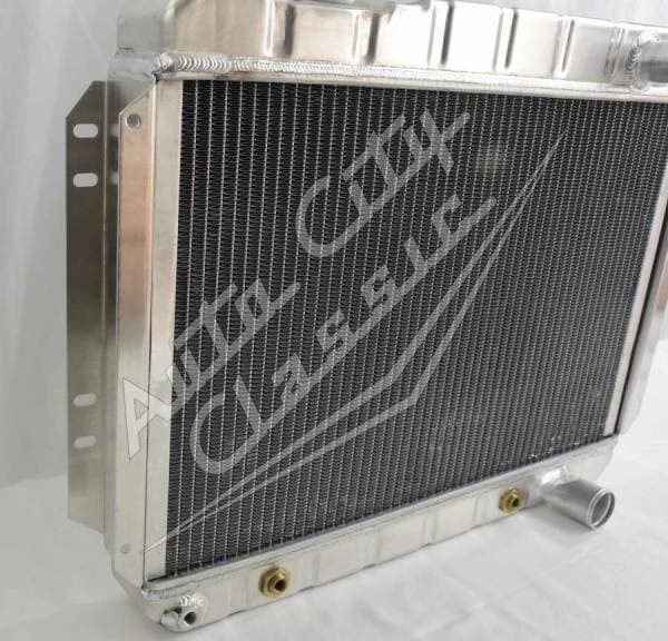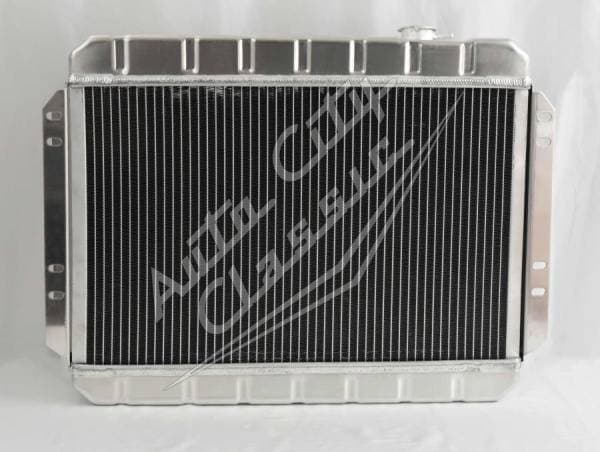 Stamped and ribbed direct bolt in radiator with internal transmission cooler and dual 1 1/8" high flow aluminum tubes for maximum cooling
