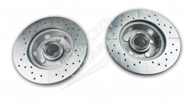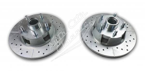 Replacement factory V8 drilled and slotted rotors with anti rust zinc coating for 64-67 Ford and Mercury models.