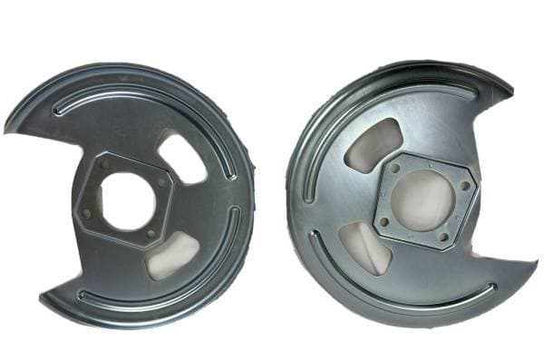 Reproduction pair of rear disc brake dust shields for 64-77 GM A, F, X Body models.