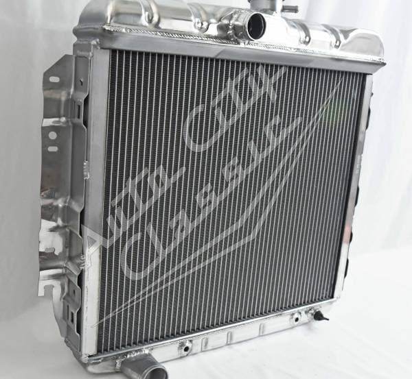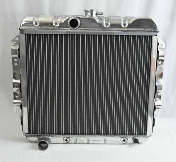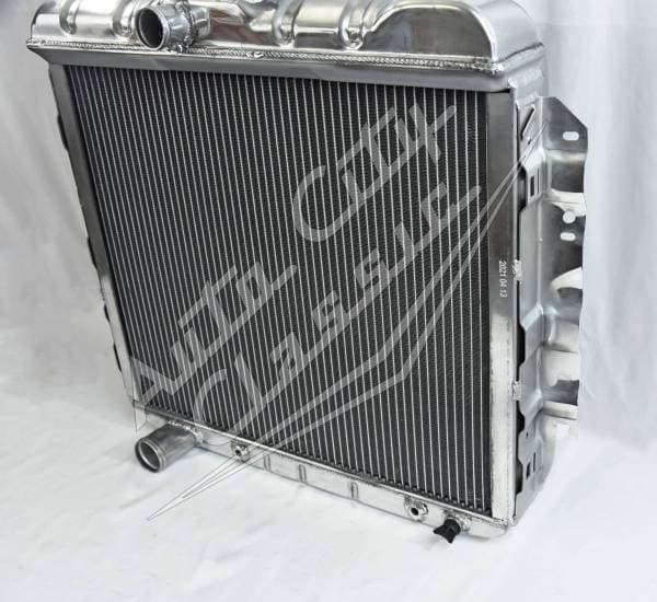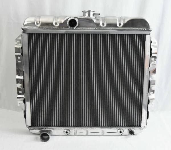 Direct replacement bolt in semi polished aluminum welded radiator with 22" core for 65-66 A Body Mopar models. Original style stamped and ribbed tanks with built in transmission cooler. Radiator has dual 1 1/8" high flow tubes for maximum cooling.