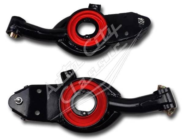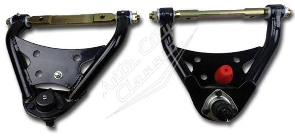 The suspension geometry is improved over stock by increasing camber gain and improving roll camber. The control arms feature new steel cross shafts which incorporate aluminum bushings adjust caster by moving the upper control arm fore/aft for more or less caster without adding alignment shims. The upper control arms also utilize greaseable bushings which make for increased stiffness over stock to provide more consistent and precise handling. The a arms come assembled with new ball joints ready to install just like the photo. The tubular lower control arms replace stock lower control arms. The lower a arms have a 2 inch drop pocket.