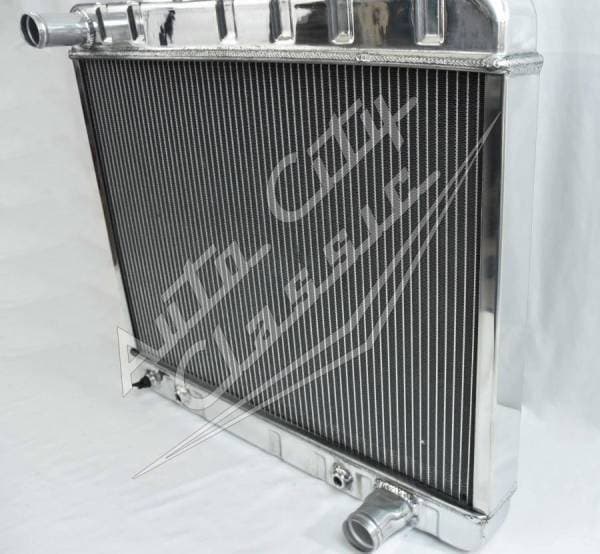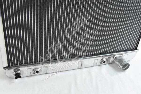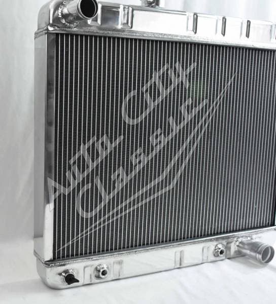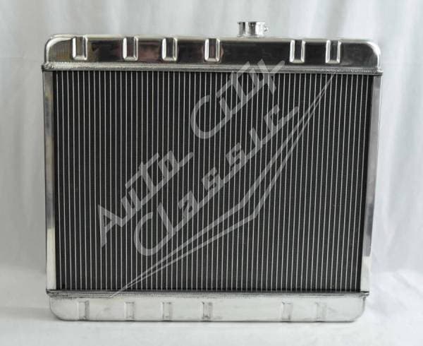 Direct replacement bolt in aluminum radiator with welded construction for 66-67 GTO, Tempest and LeMans. Radiator has built in transmission cooler and dual 1 1/8" high flow tubes for maximum cooling.