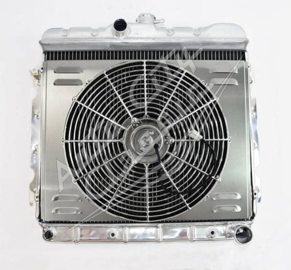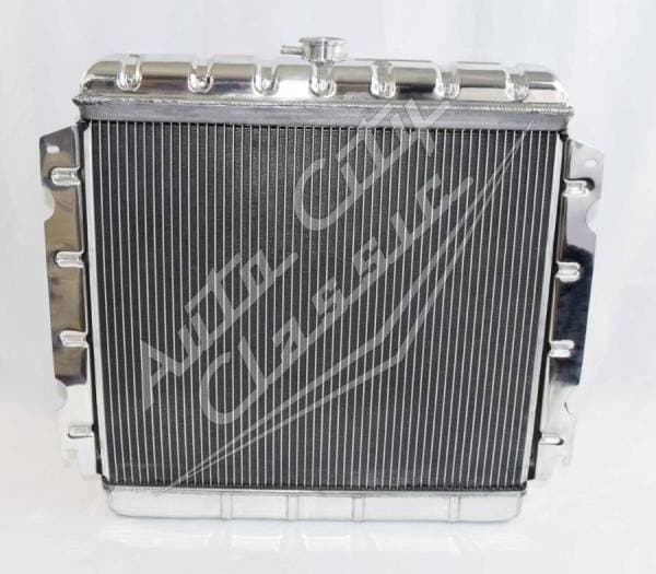 Direct replacement bolt in aluminum welded radiator with 22" core for 66-69 B Body Mopar models with V8 small blocks. Original style stamped and ribbed tanks with built in transmission cooler. Radiator has dual 1 1/8" high flow tubes for maximum cooling.