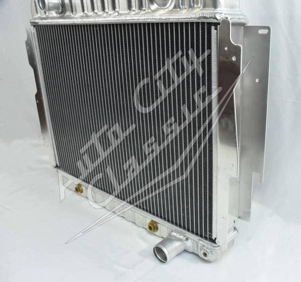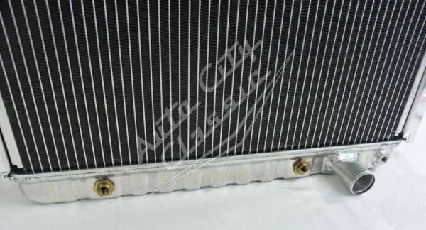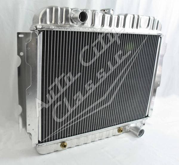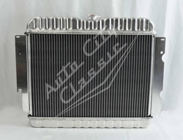 Direct replacement bolt in aluminum welded radiator with 26" core for 66-72 Mopar B & E Models with Big Block. Radiator has original style tanks with built in transmission cooler and dual 1 1/8" high flow tubes for maximum cooling.
