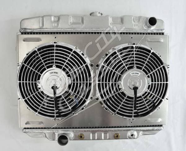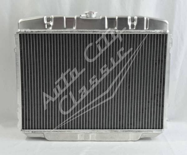 Direct replacement reproduction aluminum radiator with stamped tanks and welded construction. Radiator has built in transmission cooler and dual 1 1/8" high flow tubes for maximum capacity and cooling.
