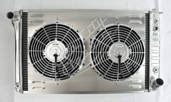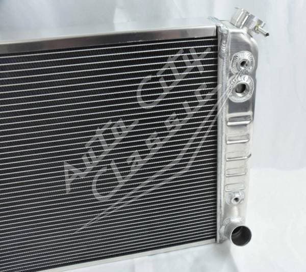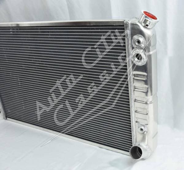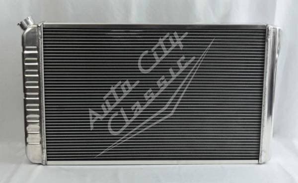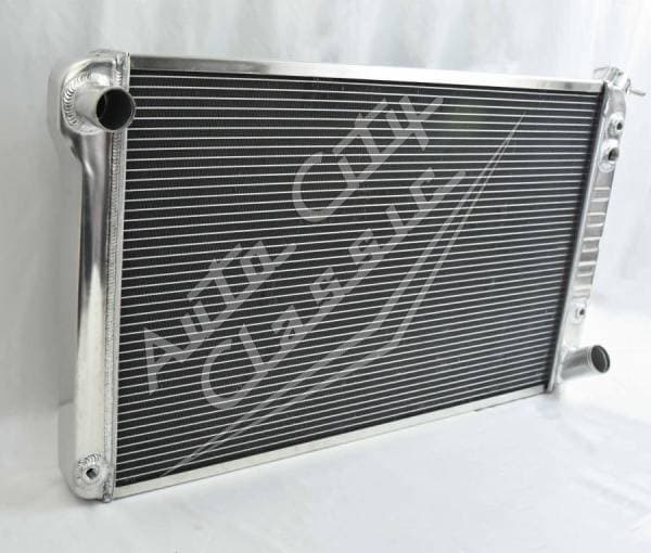 Direct replacement aluminum radiator with stamped tanks and built in transmission cooler. Radiator has dual 1 1/8" high flow tubes for maximum cooling.