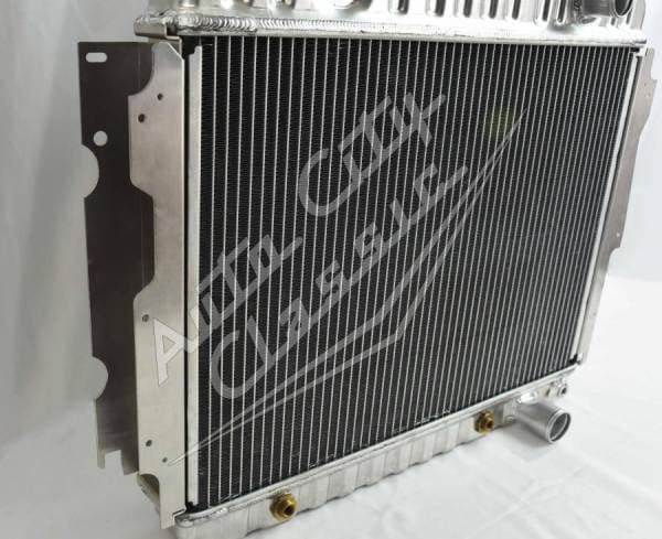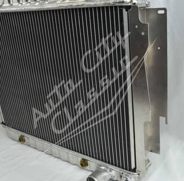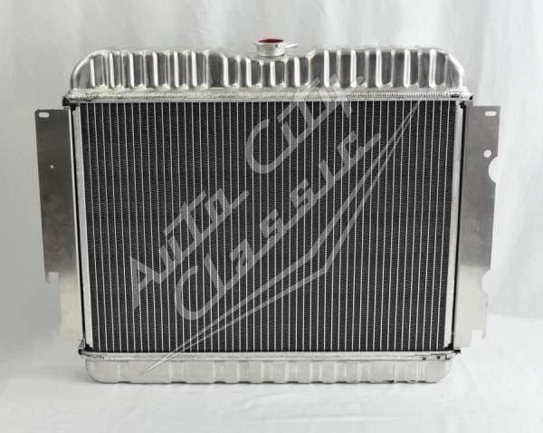Direct replacement reproduction aluminum radiator for 73 Mopars with Big Block engines and 26" wide radiator. Can be used in place of 22" radiator with conversion bracket. Radiator has built in transmission cooler and dual 1 1/8" high flow tubes for maximum capacity and cooling.