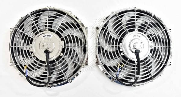Universal Cross Flow Aluminum Shroud with plastic 2600 CFM fan. Single 16" or Dual 12" available. *Exact mounting will vary depending on radiator style and brand.*