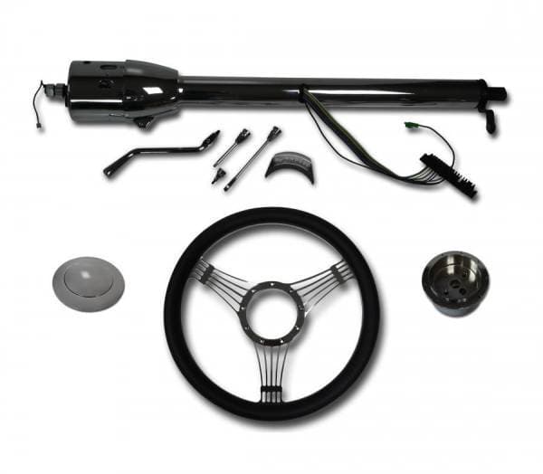Included Items: Complete Tilt Column, Shift Lever, Tilt Lever, Turn Signal Lever, Flasher Button, Black 1/2 Wrap Banjo Style Wheel, Horn Button, Correct 9 Hole Adapter for Column, and Wiring Diagram
