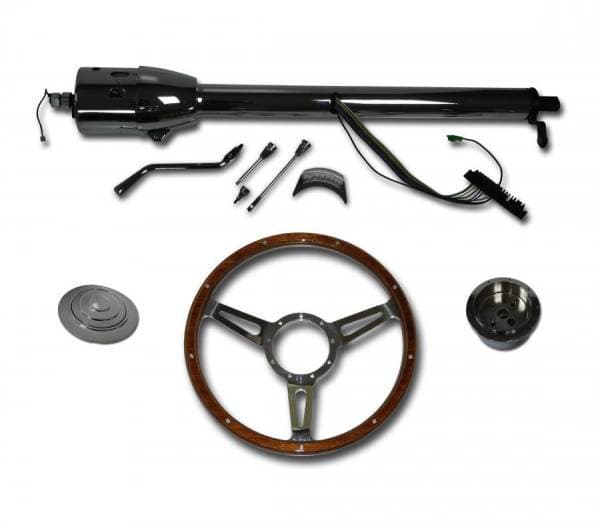 Included Items: Complete Tilt Column, Shift Lever, Tilt Lever, Turn Signal Lever, Flasher Button, GT Style Woody Wheel, Horn Button, Correct 9 Hole Adapter for Column, Wiring Diagram, 3 Speed and Overdrive Indicators