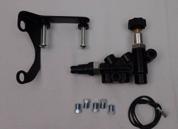 Universal proportioning valve with black finish for any dual bowl master cylinder. One front port can be plugged if only one port is needed for front brakes.